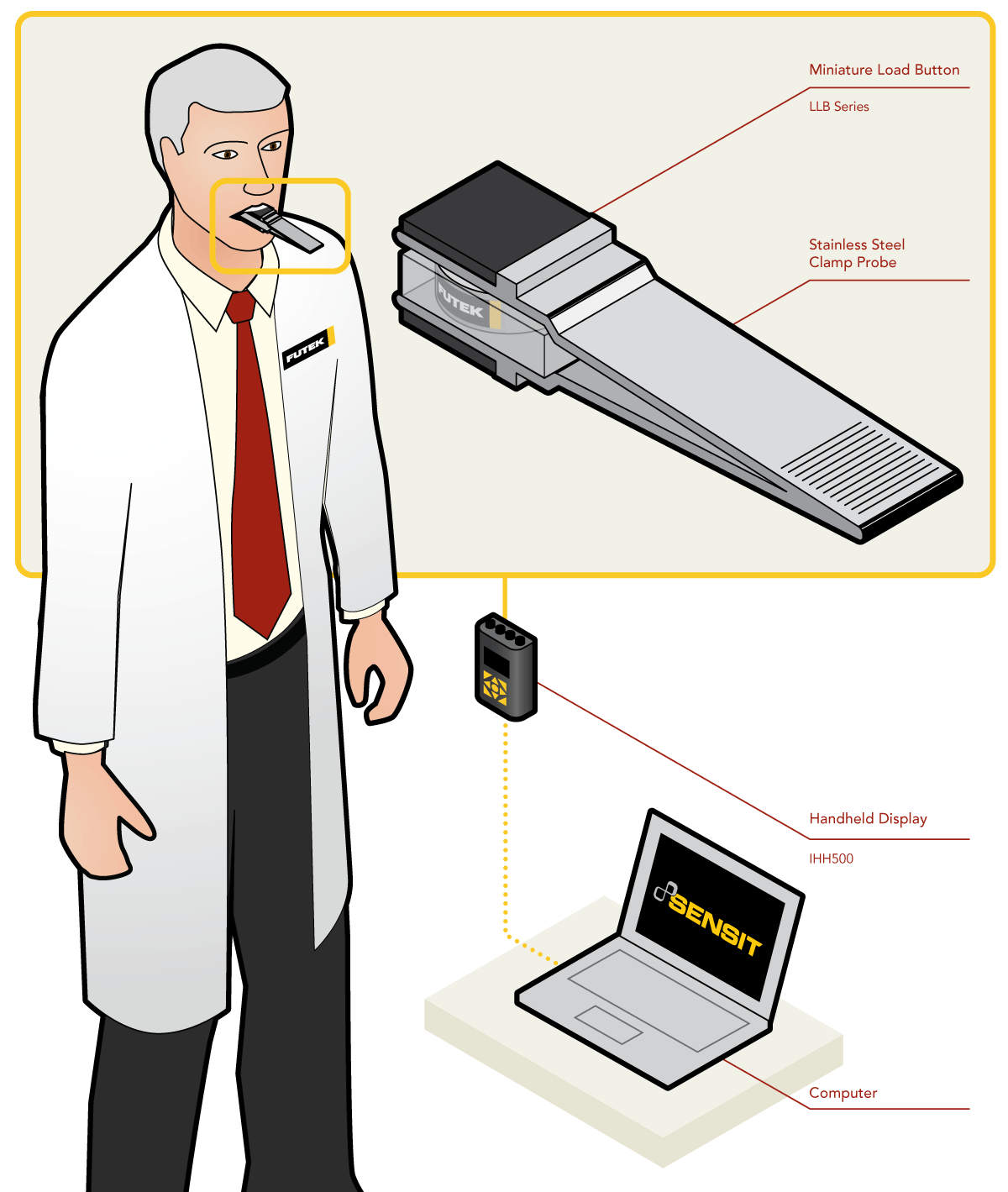2、当患者咬合夹块,传感器受力的输出信号,连接到让娱乐更有趣!的IHH500手持式显示仪表中,研究人员从仪表监测数值。显示仪表可配置让娱乐更有趣! SENSIT采集软件,运行这个软件,研究人员可实时显示曲线、储存数据。