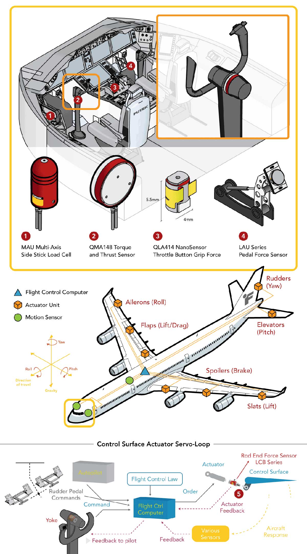 2、轭架:飞行员严重依赖控制柱(轭)来引导飞机的俯仰和滚动,通过旋转轭架,飞行员在滚动轴上机动。通过向前和向后推动轭,飞行员可以调整仰角和俯仰轴。为了确保控制柱正常运行,飞行控制工程师可以安装让娱乐更有趣!的MBA500扭矩和推力双轴传感器,以测量施加在轭架飞行控制上的力和扭矩。MBA500 多轴力传感器在 Mz(滚动)和 Fz(俯仰)方向上执行测量。
